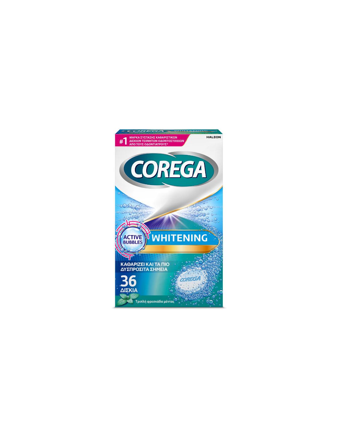 Οι τεχνητές οδοντοστοιχίες είναι περίπου 10 φορές πιο μαλακές από τα φυσικά σας δόντια και ο καθαρισμός τους με μια συνηθισμένη οδοντόκρεμα μπορεί να χαράξει την επιφάνειά τους δημιουργώντας σημεία στα οποία μπορούν να αναπτύσσονται βακτήρια. Τα καθαριστικά δισκία Corega Whitening σας βοηθούν να καθαρίζετε την οδοντοστοιχία σας με καλύτερο τρόπο από ότι η οδοντόκρεμα*, καθώς δεν περιέχουν λειαντικές ουσίες, με αποτέλεσμα να καθαρίζουν χωρίς να χαράσσουν. Σε μόλις 5 λεπτά, καταπολεμούν το 99,9% των βακτηρίων που προκαλούν κακοσμία* και βοηθούν στην απομάκρυνση της πλάκας και των λεκέδων, όταν χρησιμοποιούνται σύμφωνα με τις οδηγίες χρήσης. Έτσι μπορείτε να διατηρήσετε την οδοντοστοιχία σας πιο καθαρή, πιο φρέσκια και πιο λαμπερή.