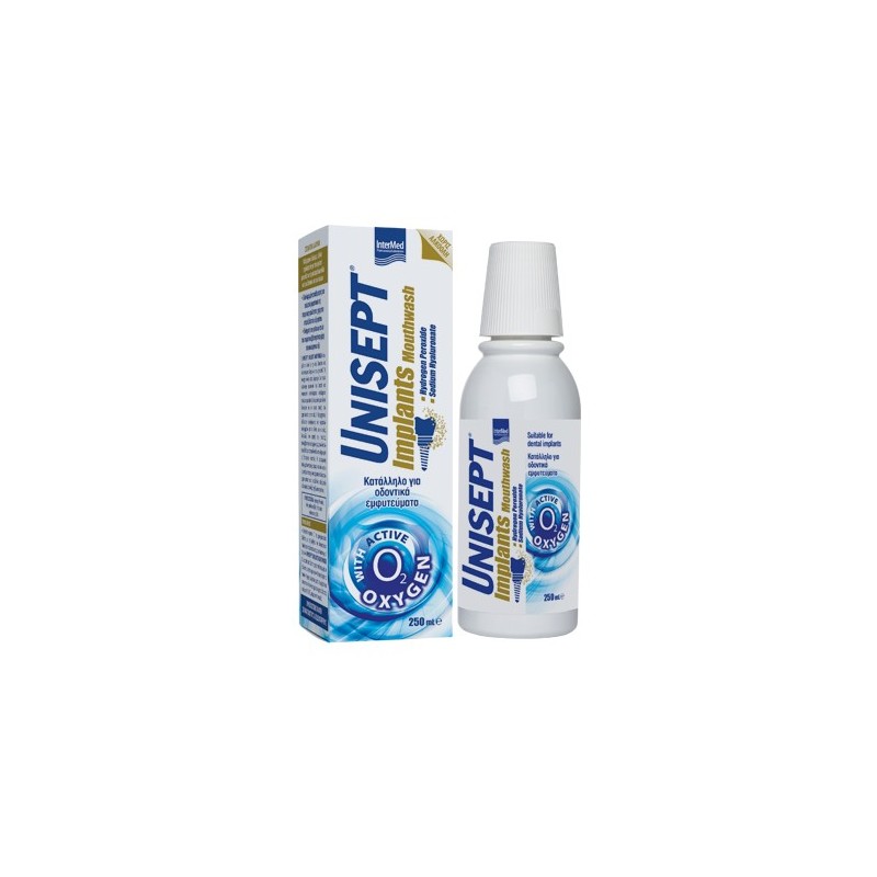 Το Unisept Implant Mouthwash είναι ένα ειδικά σχεδιασμένο καθημερινό διάλυμα. Προορίζεται για χρήση από άτομα με οδοντικά εμφυτεύματα και βοηθά στην καθημερινή προστασία της στοματικής κοιλότητας. Προάγει την επούλωση των ιστών, μετά από διαδικασίες τοποθέτησης εμφυτευμάτων, αλλά και στη μετέπειτα συντήρησή τους, συμβάλλοντας στην καθαριότητα της περιοχής γύρω από αυτά. Αποτελεσματική απομάκρυνση της ουλοοδοντικής μικροβιακής πλάκας και πρόληψη του σχηματισμού της. Χωρίς φθόριο, δεν συμβάλλει στην οξείδωση των εμφυτευμάτων.