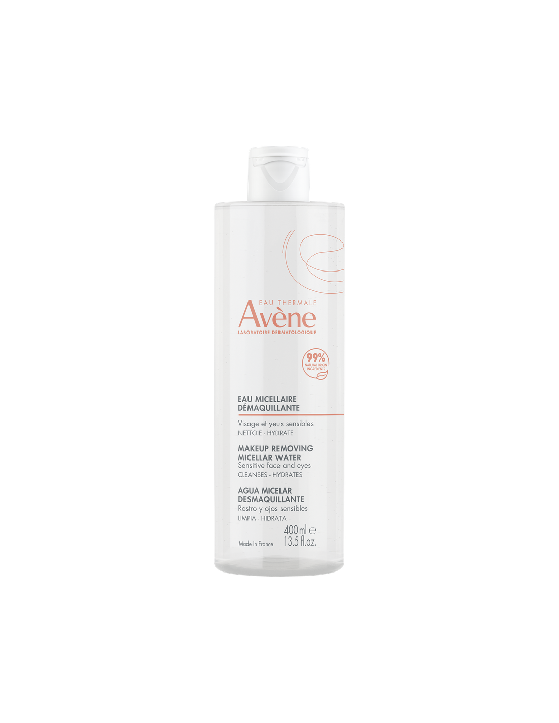 This cleansing water & makeup remover cleanses (even pollution particles*), hydrates** and soothes the sensitive face and eyes in one easy step. Contains 99% natural ingredients and no animal origin. It leaves the skin clean, soft and relieved, offering it a sense of comfort. This subtle scented revitalizing water for daily use removes make-up and imparts softness in one simple, quick step. Enhances hydration and maintains the skin's natural balance thanks to the combination of Glycerin and Trehalose and the high concentration of Avène Thermal Spring Water with soothing information. Its composition contains minimal ingredients in the right dose to ensure effectiveness and tolerance***. The eco-designed bottle is made from recycled plastic****, and can be recycled again. Cleansing & make-up remover water is suitable for contact lens wearers. The 400 ml cleansing water & makeup remover packaging is made from 87% recycled materials. The bottle is made of 100% recycled plastic****. * Evaluation of the amount of microparticles remaining after a single application in 27 subjects ** upper layers of the skin. *** Single-center penetrating study involving 32 subjects with sensitive skin and eyes, applied twice daily to face, eyes, lips and décolleté **** excluding lid