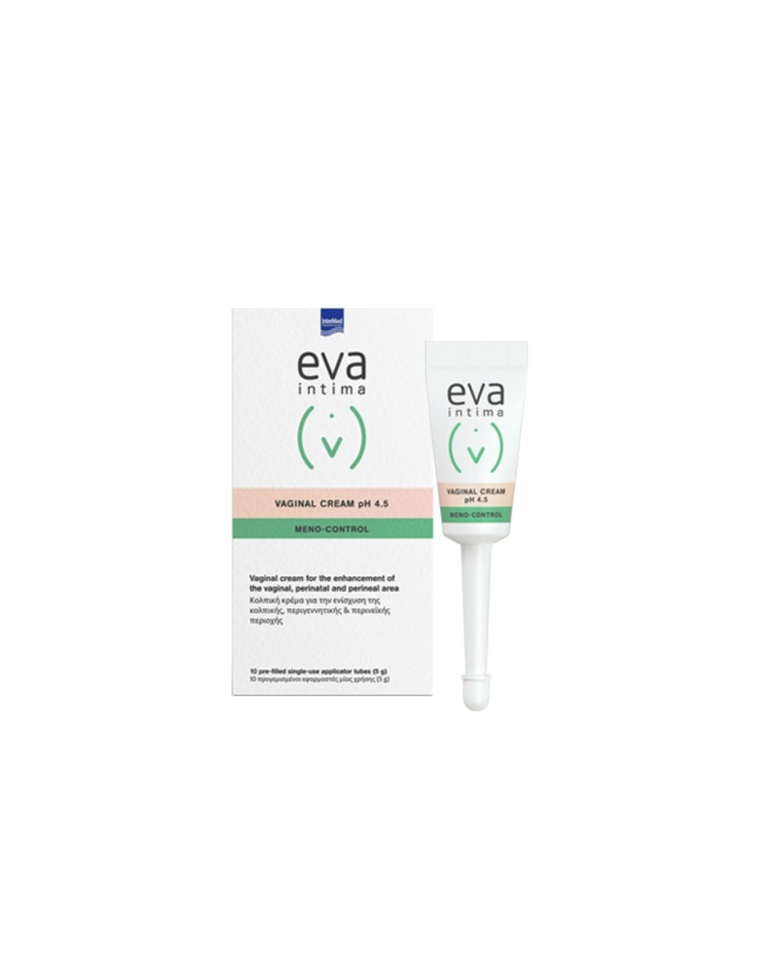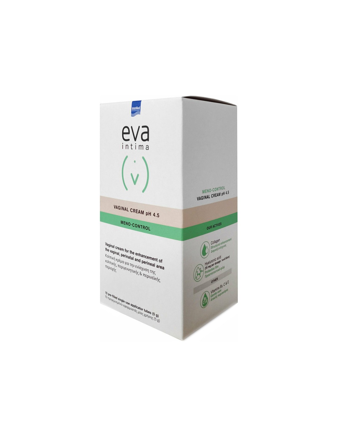 Eva Intima Meno-Control Vaginal Cream pH 4.5 by Intermed is a vaginal cream for the regeneration of the vaginal, perinatal & perineal area of the peri-menopausal woman. Contains soy isoflavones (phytoestrogens), collagen, hyaluronic acid, niacin, vitamins C & E.